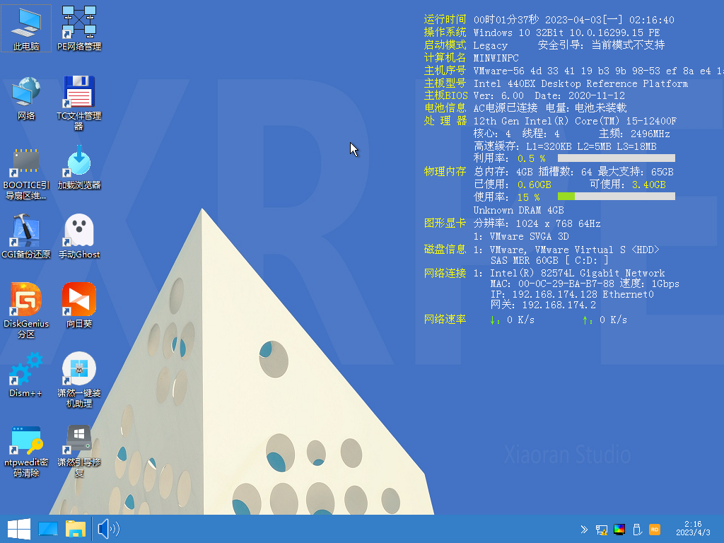 修改自@2013koko,补全了部分组件,支持使用远程,不支持TV;使用@Lightning的工具加载了提取自USBOS的系统驱动,支持服务器阵列卡、笔记本等设备读取硬盘,支持Win10下免驱的声卡,支持自动连接WiFi;支持自动安装VMTools;支持软件从快捷方式、潇然一键装机助理、HotPE模块管理在线下载安装